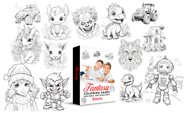 The Fantasy Coloring Pages PLR bundle is a comprehensive library of 500+ HD coloring pages themed around 15 magical categories, including Baby Dragons, Beautiful Fairies, Baby Unicorns, Evil Clowns, Treehouses, Mandala Wolves, Dinosaurs, Hero Goblins, Christmas Girls, Country Life, Robots, Space, Baby Lambs, Fantasy Interiors, and Gingerbread Houses.